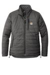 • Keep working through cold, wet weather in this women's version of our popular Gilliam Jacket. • 1.75-ounce, 100% nylon Cordura shell • Rain Defender durable water repellent • Wind Fighter technology tames wind • Nylon lining quilted to 100-gram polyester insulation • Reverse coil center front zipper • Zip-through collar • Left chest map pocket with reverse coil zipper • Two hand pockets with hidden snap closures • Two interior pockets: one zippered, one hook and loop closure • Hook and loop adjustable cuffs • Drawcord adjustable drop tail hem • Carhartt-strong, triple-stitched main seams • Carhartt label sewn on chest pocket • Relaxed fit